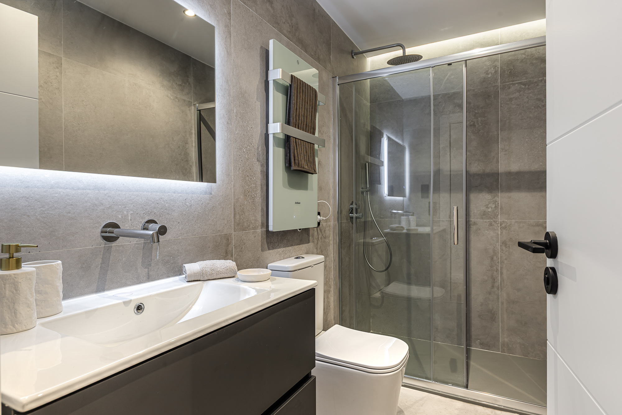 La zona social integra salón, comedor y cocina en un ambiente que resulta tan práctico como estéticamente impecable. El cuidado por los detalles se refleja en la elección de revestimientos y en una iluminación técnica que aporta profundidad a los espacios.