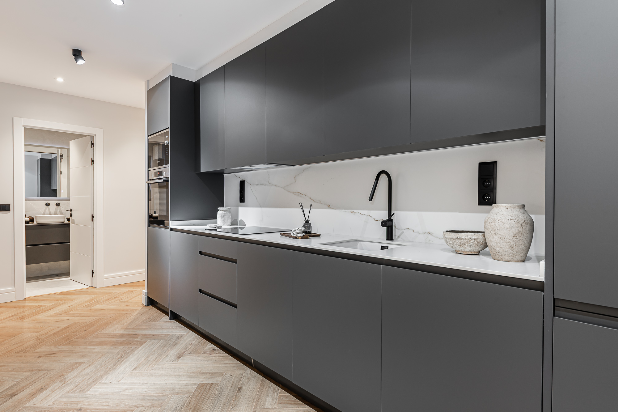 La vivienda se organiza en torno a una zona de día que integra salón y comedor, conectando directamente con una terraza privada diseñada como un espacio de desconexión. La cocina de líneas minimalistas en tonos oscuros y la iluminación técnica refuerzan la modernidad del conjunto, mientras que el suelo de madera en espiga y las molduras de los dormitorios aportan una calidez clásica y sofisticada.